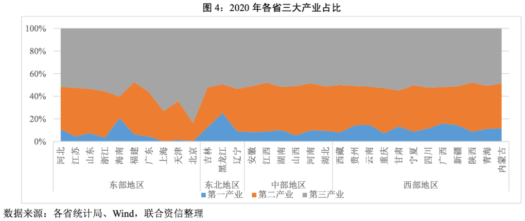 從三大產(chǎn)業(yè)規(guī)模占比看,第三產(chǎn)業(yè)是各省第一大產(chǎn)業(yè),與2019年相比幾乎沒有變化,與我國的經(jīng)濟產(chǎn)業(yè)構(gòu)成相一致。具體看,作為全國政治中心的北京以及內(nèi)陸金融中心的上海第三產(chǎn)業(yè)發(fā)展顯著優(yōu)于其他省份;海南和黑龍江的第一產(chǎn)業(yè)占比明顯高于全國其他地區(qū)。分區(qū)域看,東部地區(qū)和東北地區(qū)產(chǎn)業(yè)構(gòu)成差異更為明顯,而中部及西部地區(qū)產(chǎn)業(yè)構(gòu)成差異不大。