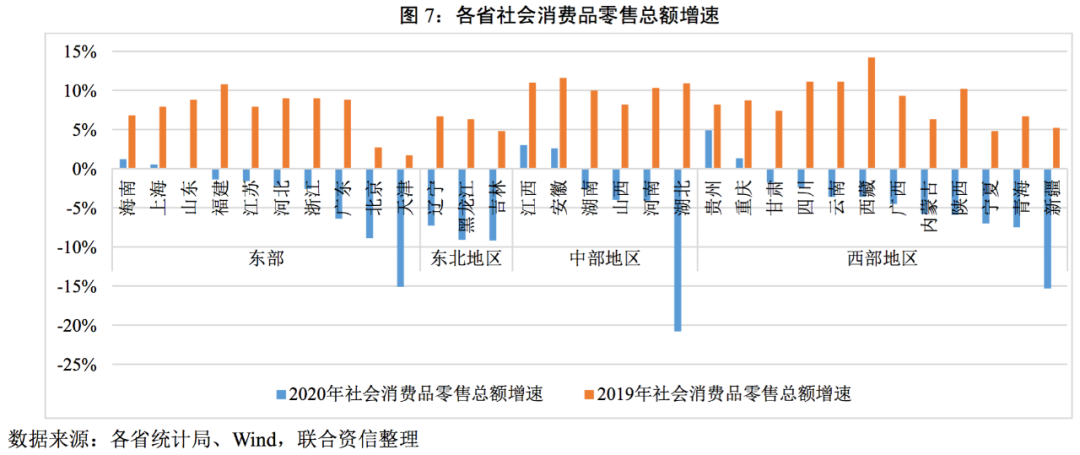 2020年全國31個省份中僅6個省份實現(xiàn)正增長,且全部尚未恢復(fù)至2019年的消費水平。貴州、江西、安徽等省份消費增速延續(xù)了2015年以來的名列前茅,其GDP增速表現(xiàn)也較為優(yōu)異,主要是其近幾年發(fā)展的優(yōu)勢新興產(chǎn)業(yè)發(fā)展較快,如貴州的電子元件、江西的半導(dǎo)體以及安徽的芯片、半導(dǎo)體以及人工智能等,帶動了經(jīng)濟的發(fā)展從而促進居民的消費能力提升。分區(qū)域看,東部、中部以及西部地區(qū)消費增速分化明顯,而東北地區(qū)消費增速排名整體較為靠后。
