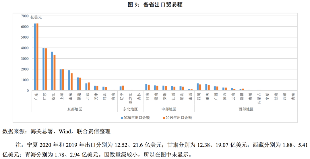 外貿(mào)方面,區(qū)域出口集中度較高。2020年,東部地區(qū)沿海城市廣東、江蘇、浙江、上海、山東以及福建出口貿(mào)易額(按美元計價)占全部出口貿(mào)易額的73.24%,上述六省出口額較2019年增長3.17%(全國增長3.60%);而全年出口額不足百億的省份全部集中在西部和東北地區(qū)。與2019年相比,有12個省份出口金額出現(xiàn)下降,19個省份出口金額上升。分區(qū)域看,2020年東部、西部、中部以及東北地區(qū)出口占我國總出口比重分別為79.11%、9.53%、9.52%和1.84%,與2019年相比,中部、東部和東北地區(qū)出口比重均有下降,其中中部地區(qū)出口比重下降5.33個百分點,下降較為明顯,西部地區(qū)出口比重略有上升。在我國的出口中,出口額較大的產(chǎn)品有機電設(shè)備、紡織品、家具玩具和車輛及零部件等,與上述東部沿海六省的產(chǎn)業(yè)結(jié)構(gòu)相對應(yīng),同時沿海的地理位置也為其出口提供了很大便利。