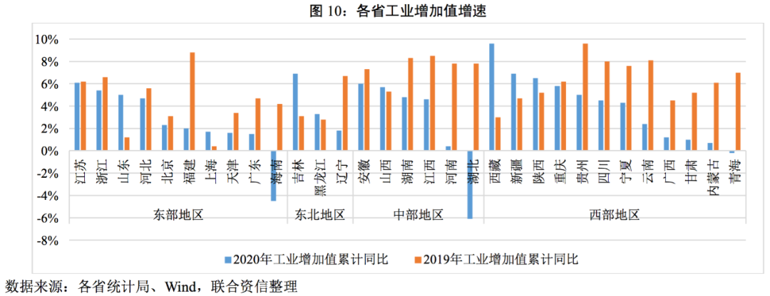 受疫情影響,2020年一季度全國工業(yè)生產(chǎn)幾乎停滯,二季度以來各地區(qū)經(jīng)濟逐漸恢復(fù),但恢復(fù)進程存在差異。從全年工業(yè)增加值增速看,僅青海、海南以及湖北三個省份的工業(yè)增加值增速尚未轉(zhuǎn)正。分區(qū)域看,各區(qū)域內(nèi)的工業(yè)恢復(fù)程度不同,分化較為明顯。西藏受疫情影響較小,工業(yè)增加值同比增長9.6%,領(lǐng)漲全國,吉林和新疆以6.9%的增速并列全國第二。吉林的第一大產(chǎn)業(yè)是汽車制造,而2020年二季度以來汽車銷售生產(chǎn)持續(xù)火熱,從而帶動吉林的工業(yè)修復(fù)增速領(lǐng)先全國。與2019年相比,僅有7個省份工業(yè)增加值增速超過2019年,大部分省份工業(yè)生產(chǎn)尚未完全從疫情中修復(fù),增速不及2019年同期水平,尤其是海南和湖北,其中湖北是因為受疫情影響最大,嚴重影響工業(yè)生產(chǎn)且復(fù)工慢于其他省份;而海南因為旅游業(yè)大幅萎縮導(dǎo)致相關(guān)的工業(yè)生產(chǎn)大幅下滑。