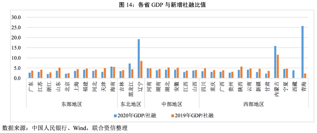 GDP與新增社融的比值可以衡量各省份的資本使用效率。從各省的數(shù)據(jù)看,大部分省份的資金并未有效拉動GDP的增長,如廣東、江蘇、浙江、山東等融資大省,資金使用效率較低,且與2019年相比進一步降低,與之相反的是,遼寧、內(nèi)蒙古、青海等經(jīng)濟規(guī)模較小的省份,資金使用效率較高,主要是由于這些地區(qū)的政府債券融資比重較大且經(jīng)濟規(guī)模較小,因此對經(jīng)濟的拉動效應(yīng)較為明顯。