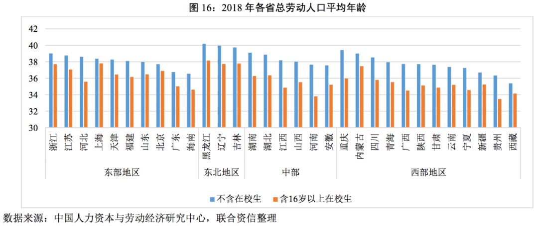 從勞動力人口來說,報告測算的數(shù)據(jù)顯示,1985-2018年間,全國勞動力人口(包括學(xué)生)的平均年齡從32.2歲上升到了38.4歲。平均年齡最高的前五個省份是黑龍江、遼寧、吉林、重慶、湖南;平均年齡最低的五個省份是廣東、新疆、海南、貴州、西藏。勞動人口的年齡分布基本與人口流動相一致,北京、上海等老齡化已逐步抬頭的較發(fā)達城市,得益于勞動力涌入而在該指標中排名中等;東北三省多年以來的人口流出使得該地區(qū)的勞動人口平均年齡顯著高于其他地區(qū)。