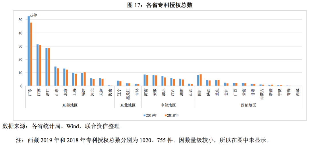 各省的科技水平也有較大差異。以專利授權(quán)數(shù)量作為各省科技水平的衡量,廣東、江蘇以及浙江具有明顯的優(yōu)勢,整體來看,擁有專利數(shù)量在10萬件以上的省份共有6個,且均集中在東部地區(qū)。整體看,專利授權(quán)數(shù)量與各省的經(jīng)濟實力呈正相關(guān)的關(guān)系,經(jīng)濟規(guī)模較大的省份擁有更多的專利數(shù)量。