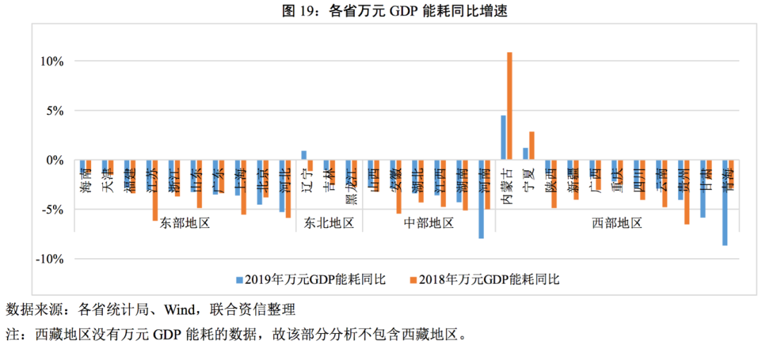 分區(qū)域看,2019年大部分省份的GDP能耗同比均有所下降,而內(nèi)蒙古和寧夏連續(xù)兩年均為正增長,且內(nèi)蒙古的增速高達4.49%,遼寧則由2018年的能耗下降轉(zhuǎn)為2019年的增長。習(xí)近平總書記在十九屆五中全會、中央經(jīng)濟工作會議、中央全面深化改革委員會會議等重要會議多次強調(diào)了抓緊制定碳排放達峰與碳中和行動方案,2020年《政府工作報告》規(guī)劃了“十四五”期間我國的能源消耗和碳排放工作。上述政策將會對以鋼鐵和石油化工等傳統(tǒng)工業(yè)為主的省份,如東三省、河北以及天津等,帶來較大的產(chǎn)業(yè)轉(zhuǎn)型壓力,同時對經(jīng)濟增長帶來一定的壓力。