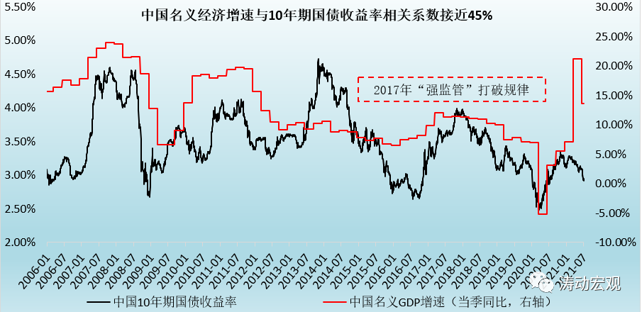 2、不過和美國一樣,中國的這種相關(guān)性同樣呈現(xiàn)出不穩(wěn)定性的特征,2010年之后這種規(guī)律曾兩次被主觀因素打破,分別為2013年的“錢荒”和2017年的“強監(jiān)管”,使得名義經(jīng)濟增速在下行通道的過程中,10年期國債收益率仍然繼續(xù)大幅上行。其中,2013年10年期國債收益率甚至上行至4.55%附近,2017年也上行至4%左右。這使得2009年以來的經(jīng)濟基本面與10年期國債收益率之間的相關(guān)系數(shù)降至40%附近。