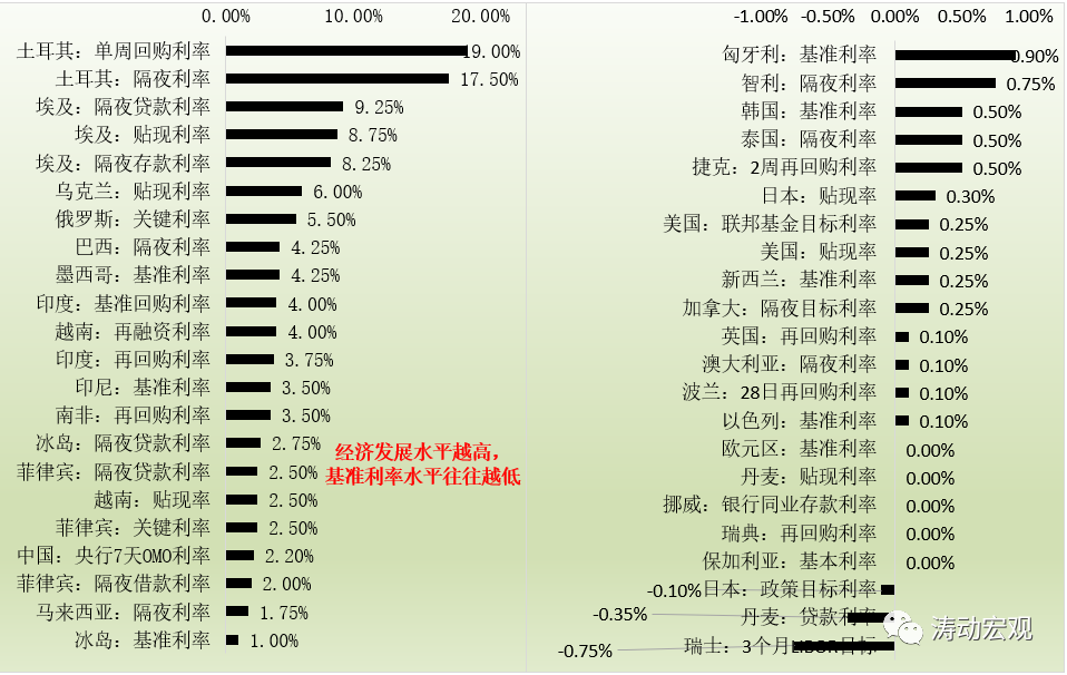 以主要經(jīng)濟體的最新基準利率數(shù)據(jù)為例,土耳其、埃及、烏克蘭、俄羅斯、巴西、墨西哥、印度、越南等經(jīng)濟體的基準利率水平便比較高,而瑞士、丹麥、日本、挪威、加拿大、澳大利亞、新西蘭與美國等經(jīng)濟體的利率水平便比較低。