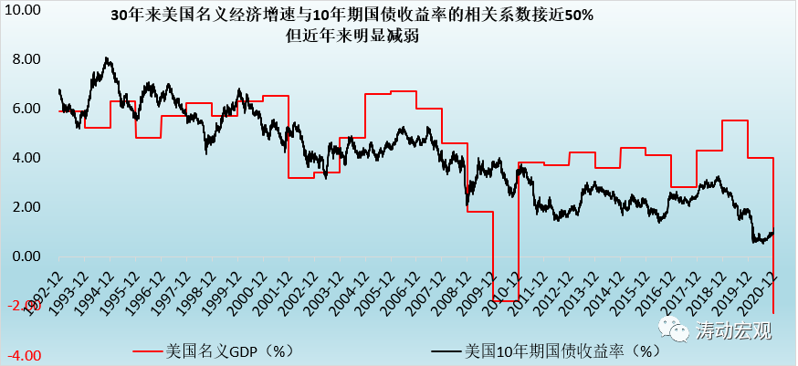 美國的數(shù)據(jù)可以向我們很好地證明這樣一個結(jié)論,即名義經(jīng)濟增速不僅和長端利率水平高度正相關(guān),在數(shù)值上甚至也比較接近。例如,1992年以來的30年,美國名義經(jīng)濟增速與10年期國債收益率的相關(guān)系數(shù)接近50%。