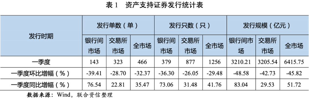 分市場(chǎng)看,2021年一季度,銀行間市場(chǎng)共發(fā)行143單379只資產(chǎn)支持證券,發(fā)行規(guī)模為3210.21億元,發(fā)行單數(shù)、只數(shù)和規(guī)模環(huán)比均大幅下降,同比均有所增長(zhǎng);交易所市場(chǎng)共發(fā)行323單877只資產(chǎn)支持證券,發(fā)行規(guī)模為3205.54億元,發(fā)行單數(shù)、只數(shù)和規(guī)模環(huán)比均大幅下降但同比均有所增長(zhǎng)(見表1)。總體看,銀行間市場(chǎng)的發(fā)行同比增幅明顯高于交易所市場(chǎng),主要源于銀行間市場(chǎng)應(yīng)收票據(jù)和個(gè)人住房抵押貸款等資產(chǎn)支持證券發(fā)行量上升所致。
