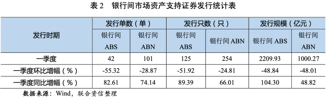 從銀行間市場(chǎng)來看,2021年一季度,信貸資產(chǎn)支持證券(以下簡(jiǎn)稱“銀行間ABS”)共發(fā)行42單125只,發(fā)行規(guī)模為2209.93億元,發(fā)行單數(shù)、只數(shù)和規(guī)模環(huán)比均有所下降,同比均有所上升;銀行間資產(chǎn)支持票據(jù)(以下簡(jiǎn)稱“銀行間ABN”)共發(fā)行101單254只,發(fā)行規(guī)模為1000.27億元,發(fā)行單數(shù)、只數(shù)和規(guī)模環(huán)比均有所下降,同比均大幅增長(zhǎng)(見表2和圖2)。總體看,一季度銀行間ABS發(fā)行單數(shù)、只數(shù)和規(guī)模同比增幅較銀行間ABN更高。一季度銀行間市場(chǎng)出現(xiàn)創(chuàng)新產(chǎn)品類型,如國(guó)網(wǎng)租賃發(fā)行了全國(guó)首單綠色碳中和資產(chǎn)支持商業(yè)票據(jù)(ABCP),實(shí)現(xiàn)了綠色金融模式的創(chuàng)新,為引導(dǎo)產(chǎn)業(yè)結(jié)構(gòu)、能源結(jié)構(gòu)向綠色低碳轉(zhuǎn)型,提供了有力的金融支持。