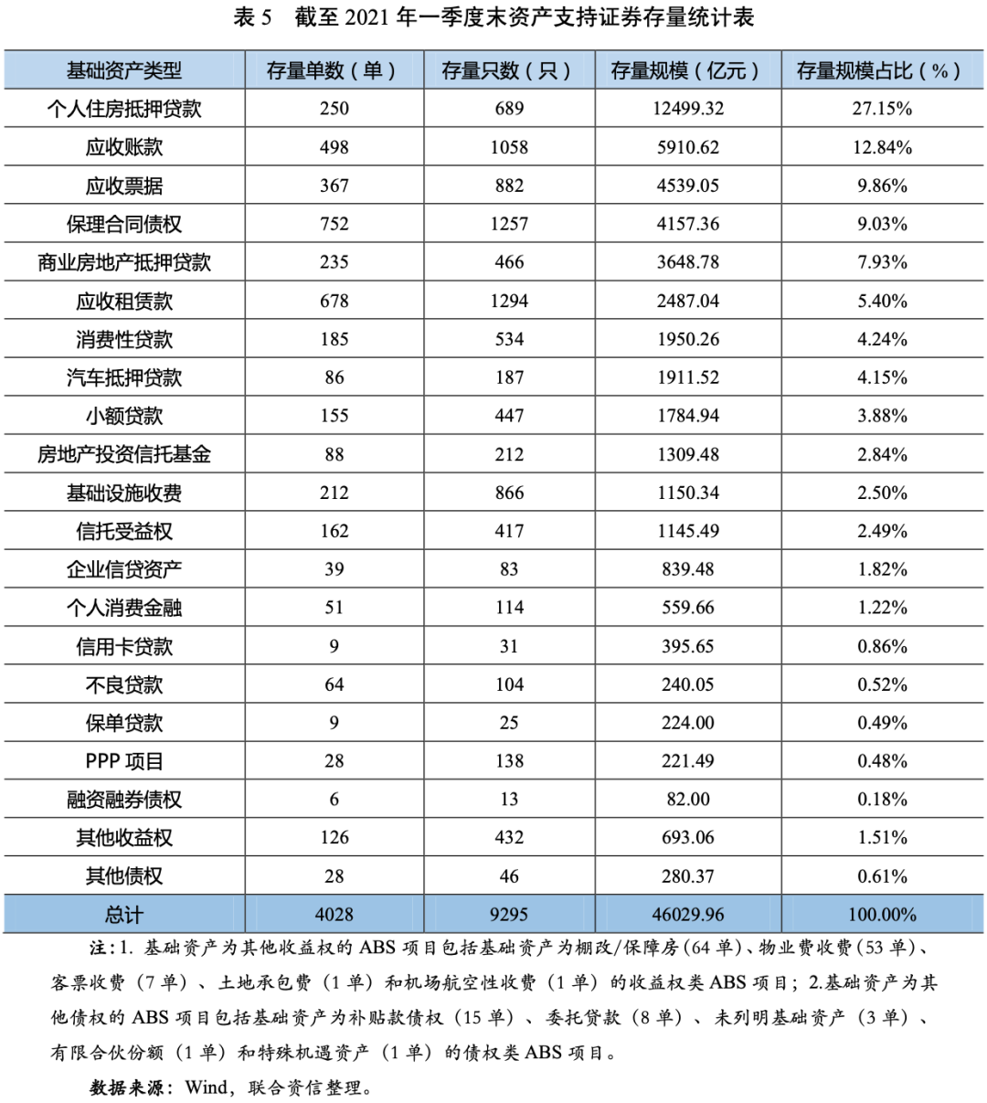 截至2021年一季度末,債券市場(chǎng)上共有4028單9295只資產(chǎn)支持證券存續(xù),本金存量規(guī)模為46029.96億元。從存量規(guī)模占比來看,前五大基礎(chǔ)資產(chǎn)類型分別為個(gè)人住房抵押貸款(27.15%)、應(yīng)收賬款(12.84%)、應(yīng)收票據(jù)(9.86%)、保理合同債權(quán)(8.91%)和商業(yè)房地產(chǎn)抵押貸款(7.93%)。