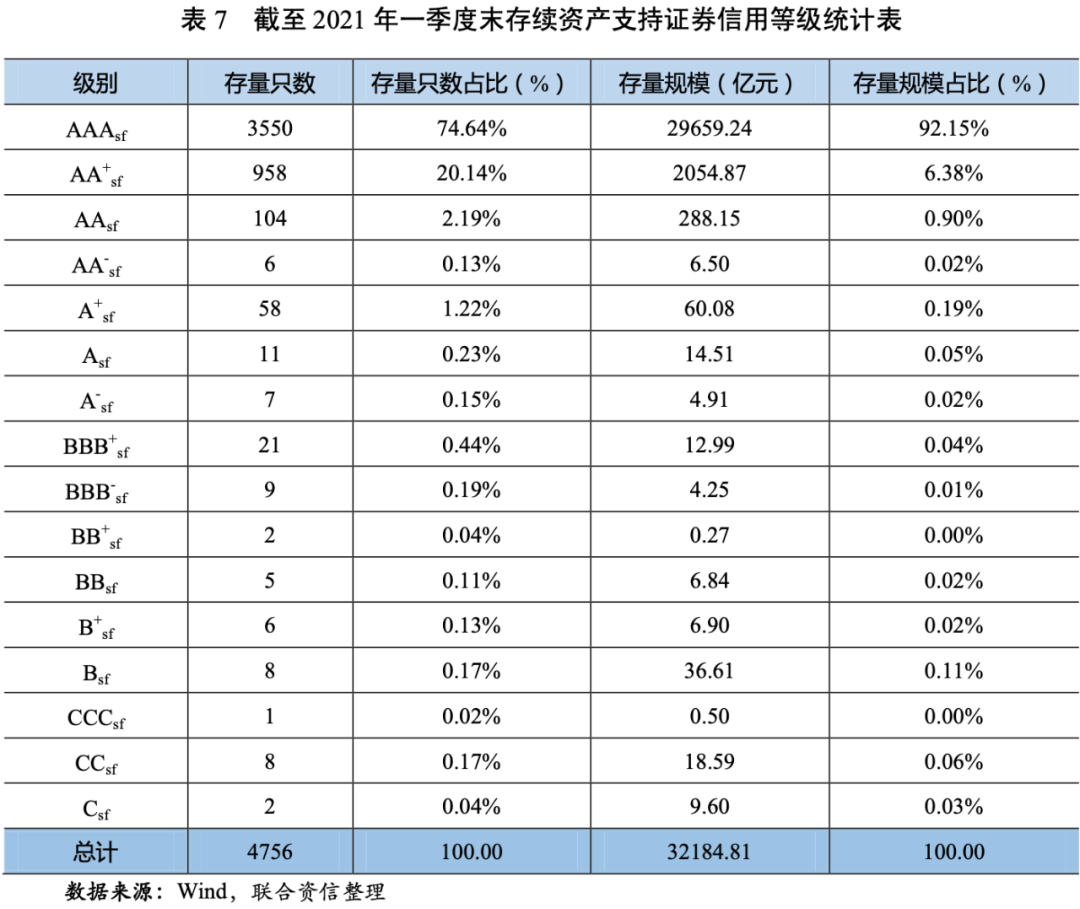 截至2021年一季度末,在存量資產(chǎn)支持證券中,有4756只具有信用評(píng)級(jí),集中于AAAsf、AA+sf和AAsf三個(gè)等級(jí)。AAAsf級(jí)、AA+sf級(jí)和AAsf級(jí)資產(chǎn)支持證券的存量只數(shù)占比分別為74.64%、20.14%和2.19%,存量規(guī)模占比分別為92.15%、6.38%和0.90%。