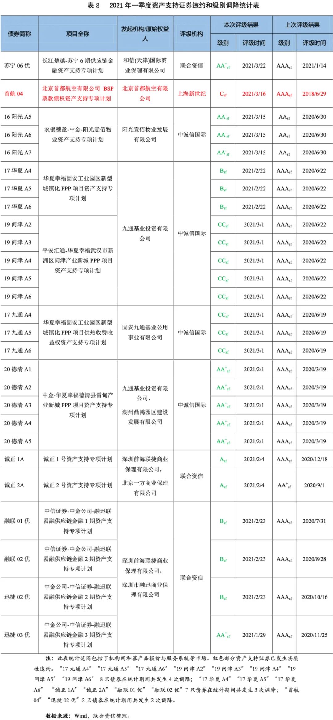 級(jí)別下調(diào)方面,市場(chǎng)共有9家原始權(quán)益人發(fā)起的13單27只資產(chǎn)支持證券債項(xiàng)評(píng)級(jí)發(fā)生下調(diào),原始權(quán)益人家數(shù)同比增加6家,發(fā)行單數(shù)同比增加11單,只數(shù)同比增加25只。其中“華夏幸福固安工業(yè)園區(qū)新型城鎮(zhèn)化PPP項(xiàng)目資產(chǎn)支持專項(xiàng)計(jì)劃”“平安匯通-華夏幸福武漢市新洲區(qū)問津產(chǎn)業(yè)新城PPP項(xiàng)目資產(chǎn)支持專項(xiàng)計(jì)劃”“華夏幸福固安工業(yè)園區(qū)新型城鎮(zhèn)化PPP項(xiàng)目供熱收費(fèi)收益權(quán)資產(chǎn)支持專項(xiàng)計(jì)劃”“誠(chéng)正1號(hào)資產(chǎn)支持專項(xiàng)計(jì)劃”“誠(chéng)正2號(hào)資產(chǎn)支持專項(xiàng)計(jì)劃”“中信證券-中金公司-融迅聯(lián)易融供應(yīng)鏈金融1期資產(chǎn)支持專項(xiàng)計(jì)劃”“中信證券-中金公司-融迅聯(lián)易融供應(yīng)鏈金融2期資產(chǎn)支持專項(xiàng)計(jì)劃”“中金公司-中信證券-融迅聯(lián)易融供應(yīng)鏈金融2期資產(chǎn)支持專項(xiàng)計(jì)劃”“北京首都航空有限公司BSP票款債權(quán)資產(chǎn)支持專項(xiàng)計(jì)劃”9單資產(chǎn)支持證券評(píng)級(jí)大幅下調(diào),共涉及17只資產(chǎn)支持證券。本季度資產(chǎn)支持證券發(fā)生評(píng)級(jí)下調(diào)的原始權(quán)益人主要集中于九通基業(yè)投資有限公司(涉及13只債券)和深圳前海聯(lián)捷商業(yè)保理有限公司(涉及6只債券),下調(diào)原因主要是受到外部擔(dān)保人、差額支付承諾人、共同債務(wù)人違約的影響。例如,九通基業(yè)投資有限公司和深圳前海聯(lián)捷商業(yè)保理有限公司發(fā)起的大部分資產(chǎn)支持證券由華夏幸福基業(yè)股份有限公司作為外部擔(dān)保人或差額支付承諾人[6],2020年1月份以來,由于新冠疫情疊加環(huán)京房地產(chǎn)調(diào)控政策嚴(yán)厲導(dǎo)致華夏幸福基業(yè)股份有限公司的主營(yíng)基金銷售金額及回款同比下滑,經(jīng)營(yíng)業(yè)績(jī)承壓,財(cái)務(wù)狀況惡化,同時(shí),公司債務(wù)規(guī)模持續(xù)攀升、短期債務(wù)占比上升,杠杠水平持續(xù)高位,2021年1月份以來華夏幸福基業(yè)股份有限公司主體評(píng)級(jí)連續(xù)被下調(diào)至C級(jí),并由此引發(fā)其增信的關(guān)聯(lián)方九通基業(yè)投資有限公司和深圳前海聯(lián)捷商業(yè)保理有限公司發(fā)起的大部分資產(chǎn)支持證券的級(jí)別下調(diào)。