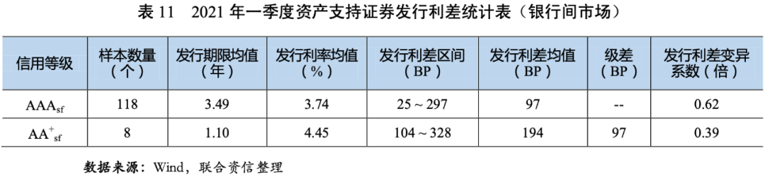 2021年一季度,資產(chǎn)支持證券的發(fā)行利率和利差均值均隨信用等級(jí)的下降而上升,說明信用評(píng)級(jí)對(duì)資產(chǎn)支持證券的信用風(fēng)險(xiǎn)具有較好的區(qū)分度。AAAsf、AA+sf和AAsf級(jí)資產(chǎn)支持證券的發(fā)行利差均值分別為163BP、262BP和484BP,AAAsf、AA+sf和AAsf級(jí)資產(chǎn)支持證券的發(fā)行利差均值環(huán)比分別上升24BP、33BP和201BP;AAAsf級(jí)和AA+sf級(jí)資產(chǎn)支持證券的發(fā)行利差同比分別下降28BP和47BP,AAsf級(jí)資產(chǎn)支持證券的發(fā)行利差同比上升26BP。AAAsf級(jí)和AA+sf級(jí)、AA+sf級(jí)和AAsf級(jí)之間的級(jí)差分別為100BP和222BP,級(jí)差隨級(jí)別的下降而上升,反映了在經(jīng)濟(jì)恢復(fù)不均衡、貨幣政策回歸常態(tài)的背景下,市場(chǎng)不確定性上升,投資者對(duì)低級(jí)別資產(chǎn)支持證券要求的風(fēng)險(xiǎn)溢價(jià)進(jìn)一步提高。AAAsf級(jí)資產(chǎn)支持證券的發(fā)行利差的變異系數(shù)相對(duì)較高,說明投資者對(duì)AAAsf級(jí)資產(chǎn)支持證券的信用風(fēng)險(xiǎn)判斷存在分化。