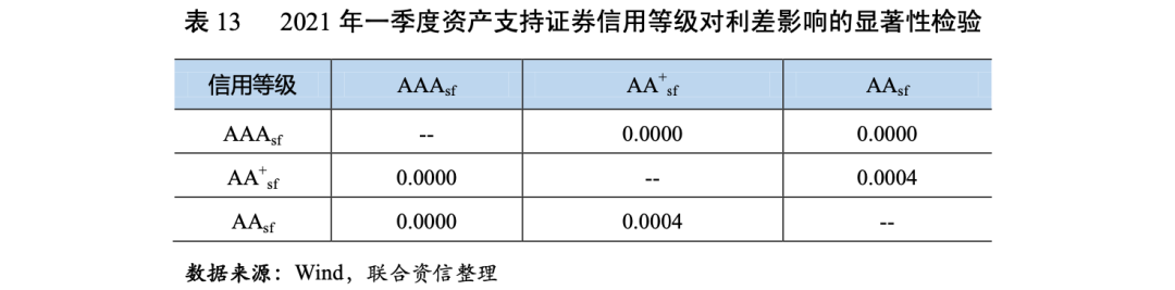 為了檢驗(yàn)信用等級(jí)對(duì)資產(chǎn)支持證券發(fā)行利差影響的顯著性,我們采用了Mann-Whitney U 兩獨(dú)立樣本非參數(shù)檢驗(yàn)方法,對(duì)AAAsf、AA+sf和AAsf級(jí)兩兩之間的利差分布進(jìn)行顯著性檢驗(yàn)。2021年一季度,在95%的置信水平下,AAAsf級(jí)和AA+sf級(jí)、AAAsf級(jí)和AAsf級(jí)之間、AA+sf級(jí)和AAsf級(jí)之間均通過檢驗(yàn),具有顯著性差異。整體來看,信用等級(jí)對(duì)發(fā)行利差具有區(qū)分性,評(píng)級(jí)結(jié)果得到了投資者認(rèn)可(表13)。