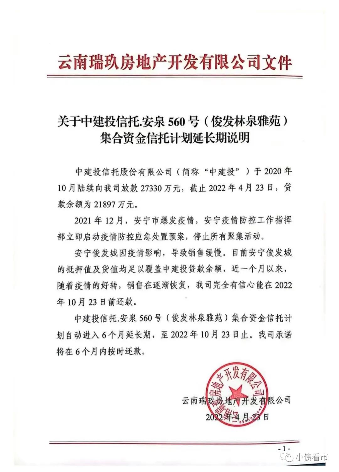 說明顯示,安寧俊發城因疫情影響,導致銷售緩慢,中建投信托安泉560號集合資金信托計劃自動進入6個月延長期,至2022年10月23日止,公司承諾將在6個月內按時還款。