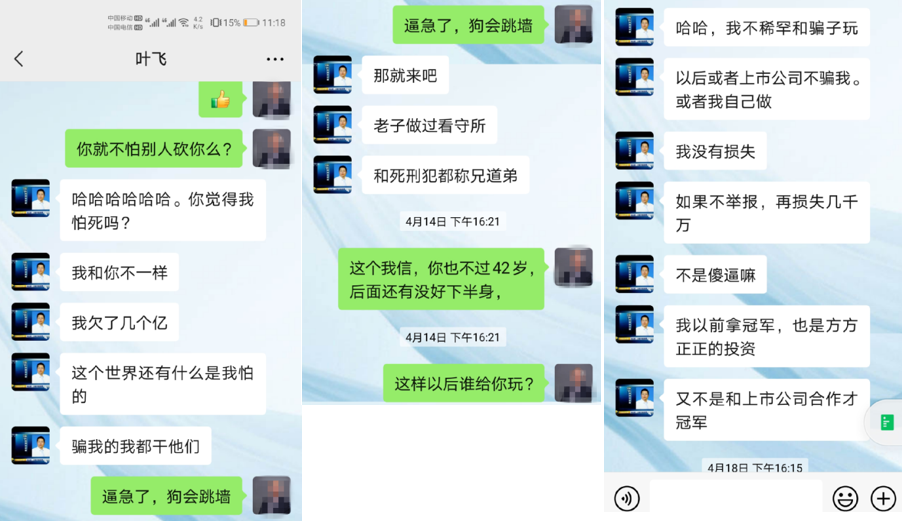 “看我最近跟葉飛的聊天就知道葉飛的性格了,只要有人得罪他就天不怕、地不怕的那種,包括光頭我跟他也沒有實質的業務往來。我怕有一天我得罪他了,他也會這樣對我的?!痹摵糜颜f道。