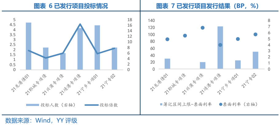 投資人對已發項目認購熱情總體相對一般。從全場倍數來看,除了“21靖港專項債”和“21寧專02”全場認購倍數超過2倍,其余4只債券全場倍數均低于2倍;從“簿記區間上限-票面利率”這一指標來看,“21靖港專項債”為123BP,其他項目為0至50BP。由鄆城縣水滸城市建設置業有限公司發行,重慶三峽融資擔保集團股份有限公司進行擔保的“21鄆城專項債”,投資者關注度相對較弱。全場認購倍數為1.18,最終票面利率發在簿記區間上限5.5%。根據《21世紀經濟報道》的報道,該債券被爆出發行人通過買保險抵補利差的方式發行。投資者關注度最高的項目為由靖江港口集團有限公司發行,中債信用增進投資股份有限公司進行擔保的“21靖港專項債”,該項目全場倍數為4.57,票面利率為3.97%,距離簿記區間上限5.2%有123BP。一方面,雖然發行人YY等級為7-,但是中債信用增進投資股份有限公司為其提供擔保,增信效力較強,債項資質較好。另一方面,根據Wind,發行人靖江港口集團有限公司已發行20期債券,總計規模為99.1億元,存續債券為53.1億元,發行人所處江蘇省靖江市,投資人對發行主體和區域有一定了解和認可。