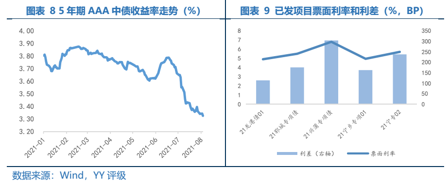目前已發行項目數量較少,多數項目由擔保公司進行擔保,使得債項評級達到AAA。截止至2021年8月15日,已有5家城投平臺發行6只縣城專項企業債,其中寧鄉經濟技術開發區建設投資有限公司發行的是雙品種企業債,整體發行單數偏少。除了“21寧專02”無擔保外,其余5只債券均加了擔保使得債項評級達到AAA。此次發行指引的其中一個實質性利好就是“支持縣城特別是縣城新型城鎮化建設示范地區內主體信用評級優良的企業,以自身信用發行本專項企業債券”。在此之前,對于非省會城市的AA縣平臺,發改委一般要求有擔保措施,這一條對發行條件有所放松。多數債券還是選擇加擔保進行發行,可能因為這些平臺資質稍弱,若不加擔保,投資者認可度較差,發行難度有所增加。再進一步細看,5只債券中有4只選擇了不同的4家融資擔保公司進行擔保,另外1只債券“21龍港債01”由溫州市級主要平臺溫州市城市建設發展集團有限公司進行擔保。相比于由市場化的擔保公司對債券進行擔保,由其他層級更高的平臺進行擔保,減少擔保費用的支出,同時體現了區域內的城投資源協調。2021年8月5日寧鄉經濟技術開發區建設投資有限公司發行的“21寧專02”(品種一)為首只未加擔保的縣城專項企業債,最終發行利率為5.70%,較由湖北省融資擔保集團擔保的“21寧專02”(品種二)的發行利率4.95%,高出75BP。