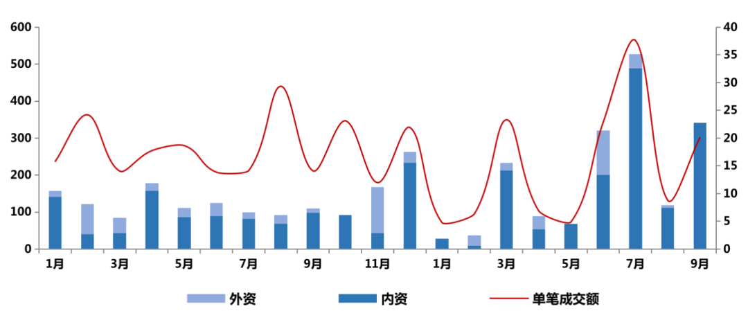 同時,總成交單數與同比略有上升,平均單筆成交額同比上升65.9%至22.4億元/筆,全國性大宗的整體交易推升平均成交額大幅上升。