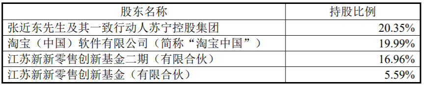 收購(gòu)?fù)瓿珊螅K寧易購(gòu)的前四大股東為:張近東及其一致行動(dòng)人持有20.35%股份,淘寶中國(guó)持有19.99%股份,新新零售基金二期為第三大股東,持有16.96%股份,而新新零售基金一期持有5.59%股份。