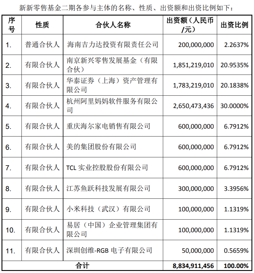 根據(jù)披露的數(shù)據(jù),新新零售基金由南京市國(guó)資和阿里領(lǐng)銜美的、海爾、小米、TCL、創(chuàng)維等產(chǎn)業(yè)投資人組成,總共認(rèn)繳出資額88.35億元,其中LP(有限合伙人10家),GP(普通合伙人)1家。