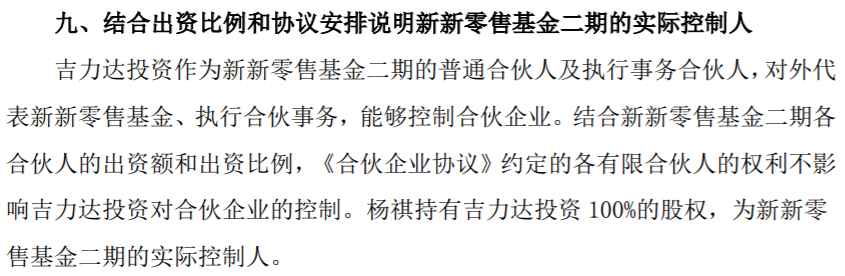 所以新新零售基金二期的控制人為海南吉力達(dá),自然人楊祺持有海南吉力達(dá)100%股權(quán),因此,楊祺為新新零售基金二期的實(shí)際控制人。