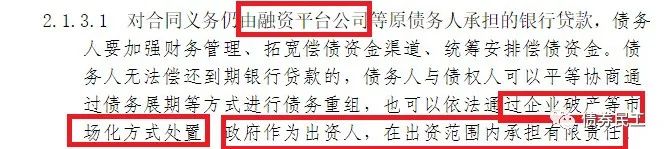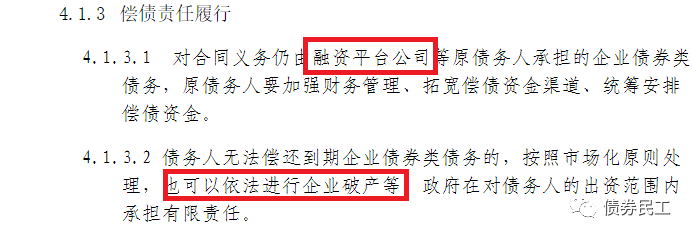 (2)對(duì)于企業(yè)債券的償債責(zé)任履行,鼓勵(lì)債務(wù)人(融資平臺(tái)公司)按照企業(yè)債券類(lèi)債務(wù)有關(guān)管理政策進(jìn)行債務(wù)重組或者通過(guò)企業(yè)破產(chǎn)等市場(chǎng)化方式處置。這里的企業(yè)債券概念應(yīng)該是廣義上的信用債券概念,也是通過(guò)債務(wù)重組和破產(chǎn)方式進(jìn)行化解債務(wù)問(wèn)題。