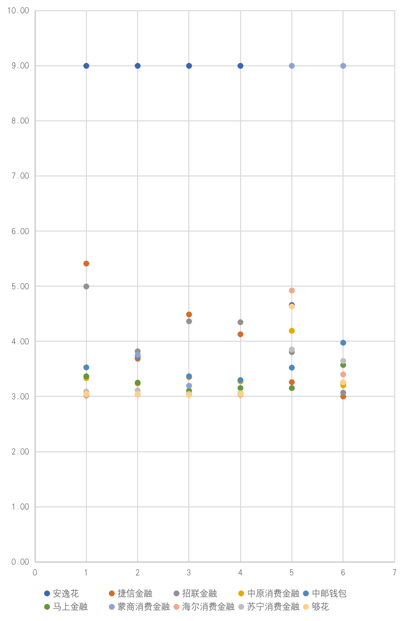 在月使用時(shí)長(zhǎng)指標(biāo)上,安逸花APP優(yōu)勢(shì)突出,遙遙領(lǐng)先于其他消費(fèi)金融APP,達(dá)到9分。招聯(lián)金融APP、蒙商消費(fèi)金融APP分別為第二名(3.82分)和第三名(3.75分),均未超過(guò)4分。