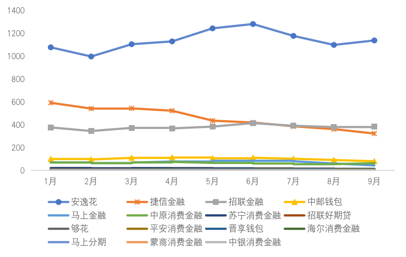 零壹智庫(kù)綜合對(duì)比15款A(yù)PP第一二三季度活躍度的評(píng)分發(fā)現(xiàn),安逸花、招聯(lián)金融、捷信金融APP的地位相對(duì)而言較為穩(wěn)定,始終位于前三。