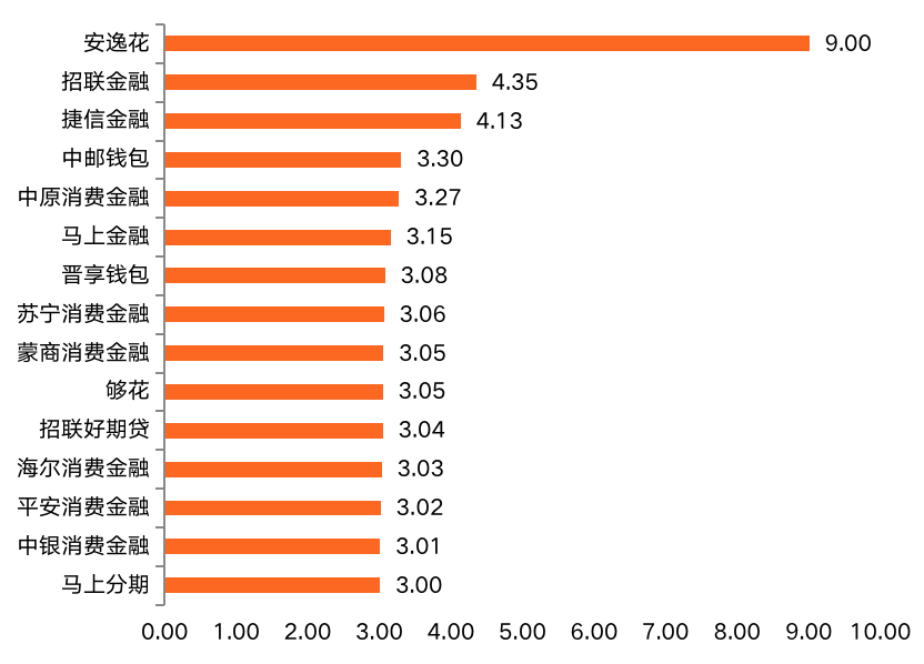 從日均活躍用戶的評(píng)分來(lái)看,安逸花APP表現(xiàn)最為突出,為9分;招聯(lián)金融APP和捷信消費(fèi)金融APP分別為第二名(4.35分)和捷信消費(fèi)金融(4.13分),其他消費(fèi)金融APP均在3分左右。