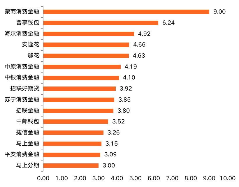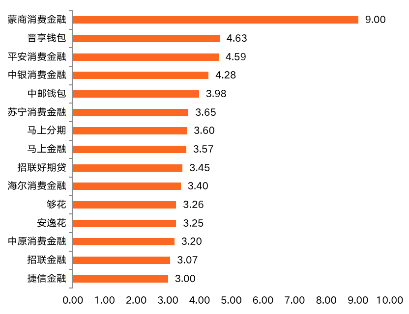 人均單日使用時(shí)長(zhǎng)一定程度上可以反映用戶依賴程度。蒙商消費(fèi)金融APP位列第一,得9分,優(yōu)勢(shì)明顯;第二名至第四名均在4-5分之間浮動(dòng),5-15名在3-4分之間浮動(dòng)。