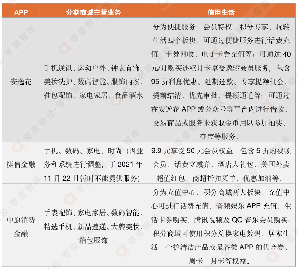 在分期商城方面,安逸花、捷信金融APP和中原消費(fèi)金融APP的分期商城都有銷(xiāo)售手機(jī)、數(shù)碼、家電和服飾,安逸花APP中的產(chǎn)品種類(lèi)更加齊全一些;捷信金融APP的分期商城因業(yè)務(wù)和系統(tǒng)進(jìn)行調(diào)整,于2021年11月22日暫時(shí)不能提供服務(wù)。