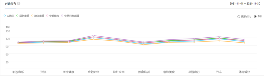 整體上男性使用者多于女性使用者,而用戶的興趣偏好分布主要集中于金融財(cái)經(jīng)、軟件應(yīng)用、汽車(chē)、醫(yī)療健康、教育培訓(xùn)、餐飲美食、 旅游出行、影視音樂(lè)、資訊、休閑愛(ài)好等多個(gè)領(lǐng)域。