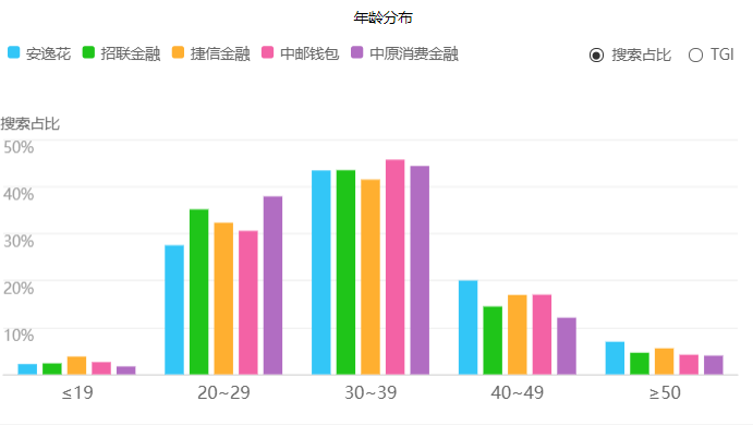 年齡主要分布在20-40歲,中青年人更傾向于使用消費(fèi)金融軟件,40歲以上人群,年齡越長(zhǎng),使用人數(shù)越少。