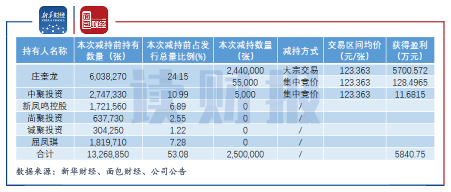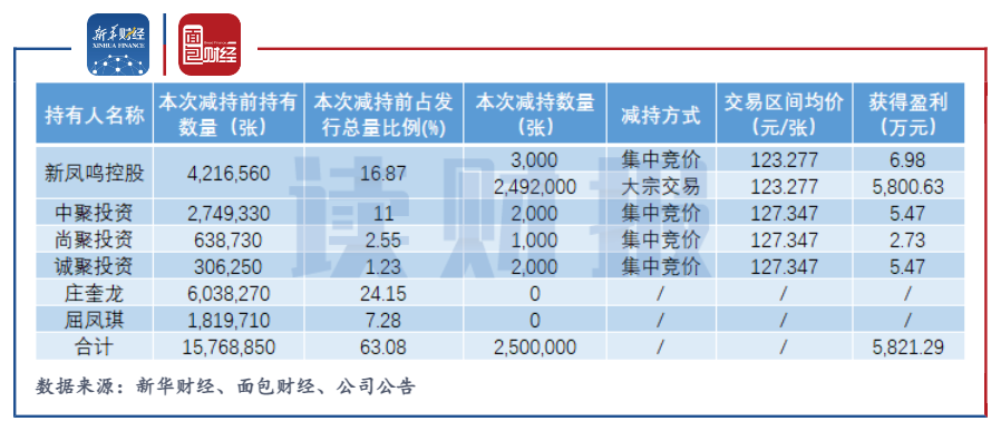 12月23日,公司再次發(fā)布可轉(zhuǎn)債減持公告,實控人莊奎龍和中聚投資在2021年12月13日至12月23日期間通過集中競價、大宗交易方式合計減持鳳21轉(zhuǎn)債250萬張。根據(jù)期間鳳21轉(zhuǎn)債交易均價123.363元/張計算,控股股東及其一致行動人此次合計套現(xiàn)3.08億元,合計獲得盈利近5841萬元。
