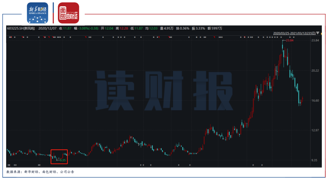 上市公司回購股份計劃往往被市場解讀為利好消息。新鳳鳴發(fā)布回購股份公告后的第二個交易日,即2020年5月25日公司股價便止跌,當日盤中最低價9.35元/股(前復權(quán))也成為公司上市至今股價的最低點。在隨后不到一年時間里,公司股價最高上漲至23.84元/股,漲幅近155%。