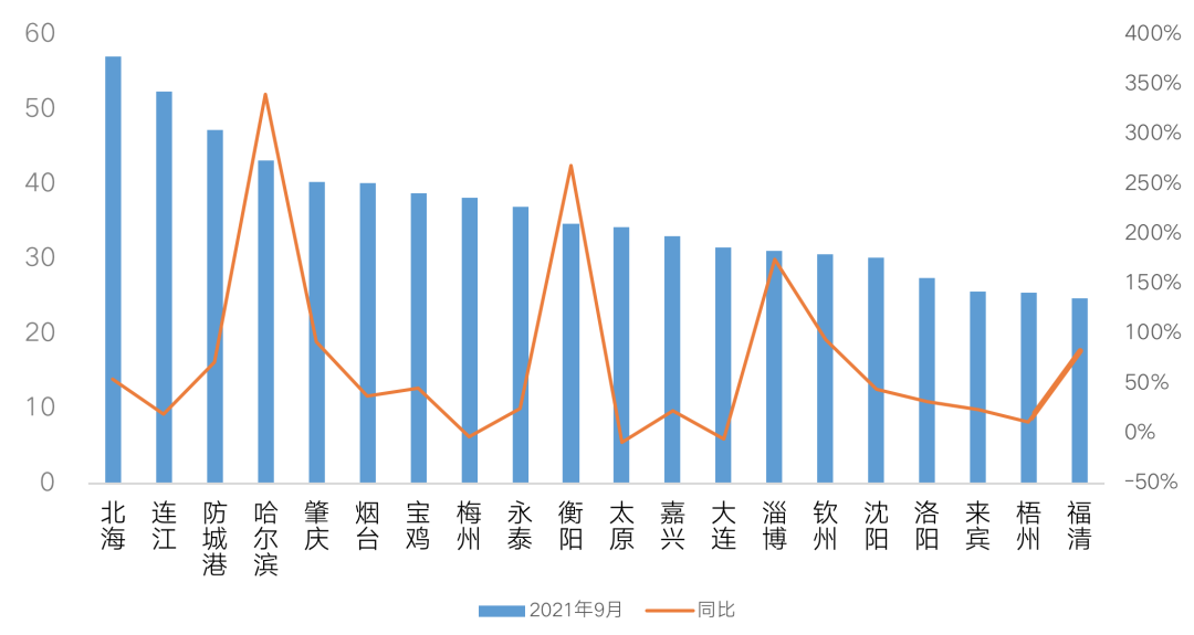 三四線城市由于供過于求加劇,成交下行致去化周期激增至17.53個月,高于百城平均。反觀下跌城市以東南沿海三四線為主,比如德清、鹽城等城市9月末消化周期維持在一年以下。而北海、連江、防城港、肇慶、煙臺、寶雞、永泰、衡陽、淄博等基本面缺乏支撐的三四線城市消化周期高達30個月以上,且同環比齊增,庫存風險依舊較大。