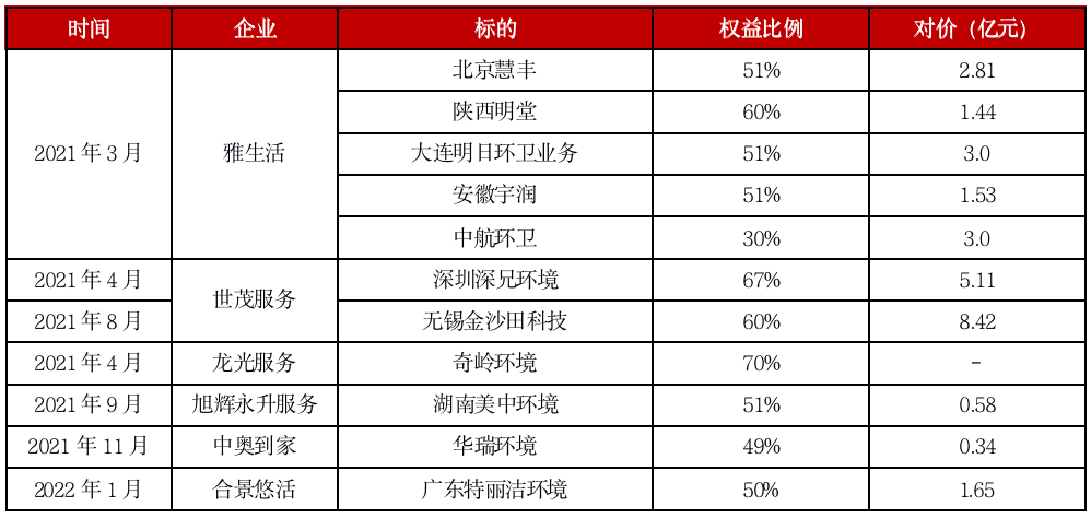 第三類,通過收購環衛企業布局環衛市場。據克而瑞物管不完全統計,2021年物企收并購共155起,其中11起以環衛為標的,占比約7.1%。