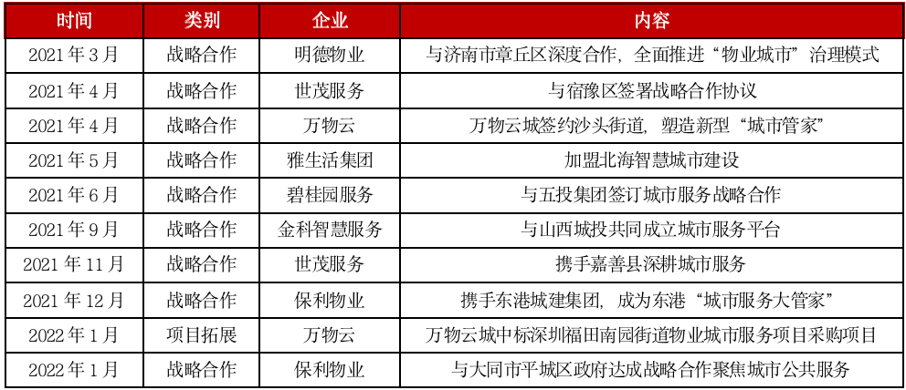 無論是通過招投標獲取單個項目,還是承接項目總包,政企資源均發揮了重要作用,2021年以來物企通過與地方政府、城投公司或戰略合作,或成立合資公司等方式,共同推進城市服務的落地。