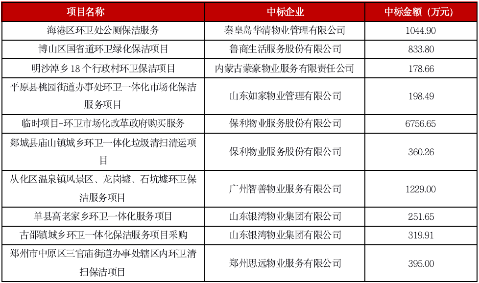 2021年部分物企獨立中標環衛項目情況