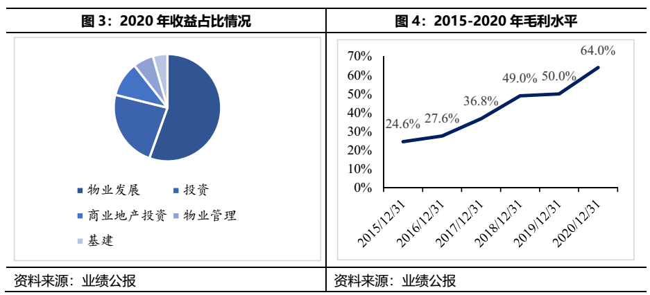 2020年集團業務主要分為住宅地產、商業地產、物業管理、基建和投資五大板塊,各板塊收入占比如下圖所示。2019年合生的業務版圖新增了基建業務,2020年繼續新增投資板塊,公司的業務版圖不斷拓展,是近幾年的一大轉變。2020年投資業務財報上的數據顯示不論是在營收規模上還是盈利情況上表現均較為優異,貢獻了23%的收入還拉高了整體的毛利。2020年,公司的毛利高達64%,遠遠超過地產公司的平均水平(25%),公司對于高毛利的解釋是由于新增投資業務表現突出所致。