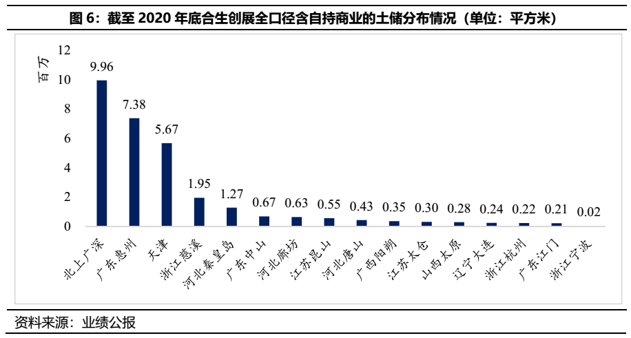 公司項目集中在環渤海、珠三角和長三角地區,主要分布于北上廣等一線城市。截至2020年底,合生創展位于以上四個城市的總土儲面積達到9.96百萬平方米,占公司總土儲面積的32.72%。由此,公司的項目主要分布在一二線城市,整體土儲質量較好。
