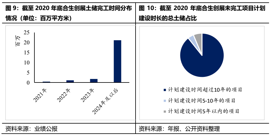 剔除上述的歷史囤地,可以發現合生創展近年來加快了高周轉項目的布局,2017年后,合生創展新增項目權益土儲建設面積中,52%的建設時間在5年以內,建設時間5年以上的項目僅兩個,主要是廣州番禺區南村鎮舊改項目土儲面積較大,放大了這部分的占比。