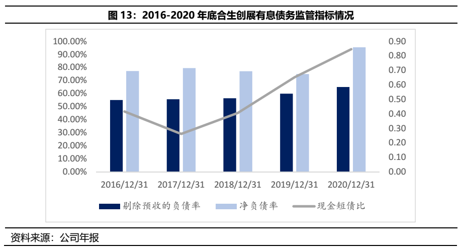 受益于早期囤地的慢周轉模式,合生創展的債務監管指標總體尚可,僅現金短債比一直較低,近年來有所改善。截至2020年末,合生創展的剔除預收的負債率、凈負債率、現金短債比分別為64.93%、95.34%、0.84,觸及一條紅線,觸及紅線的現金短債比指標近年來持續提升。