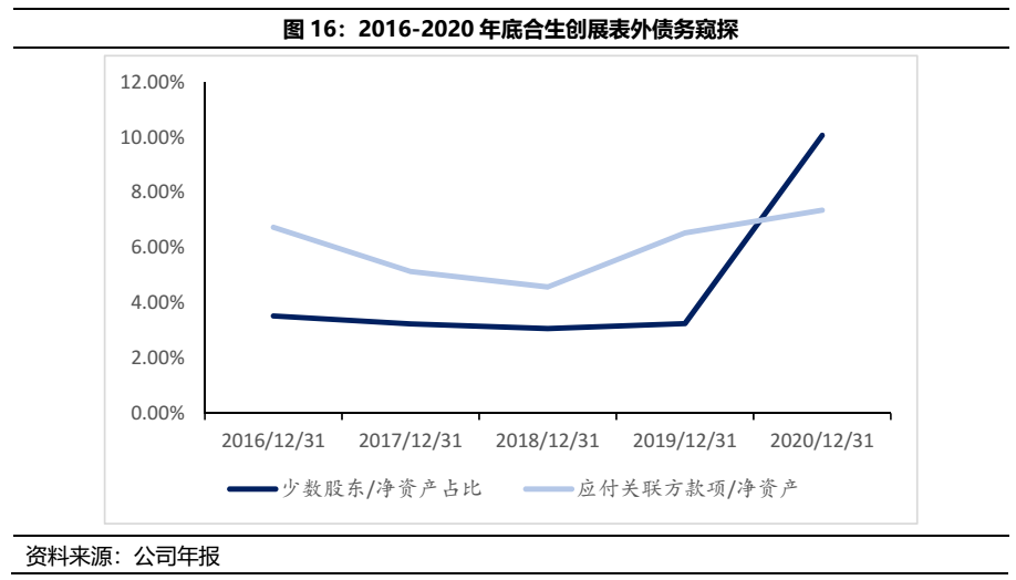簡單從少數股東/凈資產以及應付關聯方款項/凈資產兩個指標窺探,近年來基本均維持在10%以下,從此角度來看表外債務占比看似不大,但實則利用內部地產基金框架搭建,將信托資金利用多層嵌套于表外。