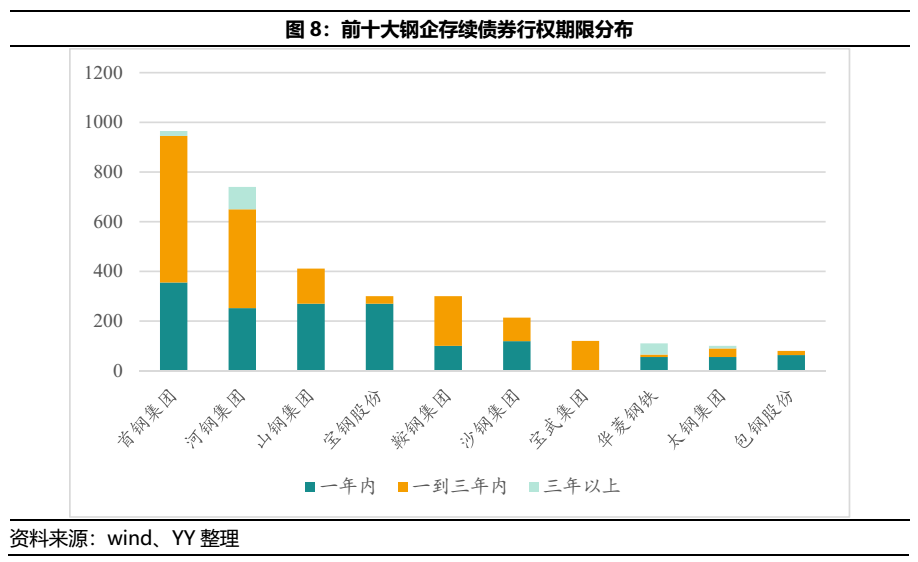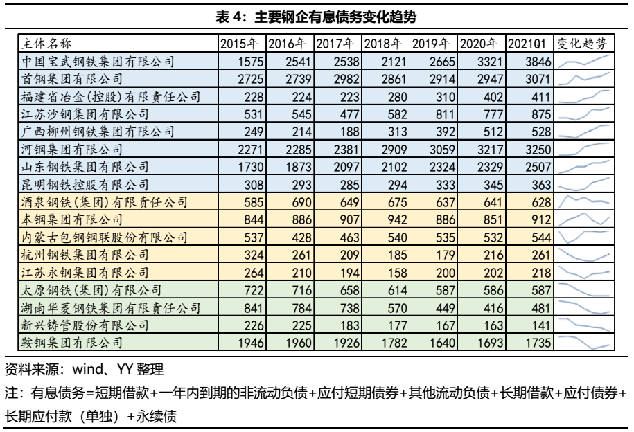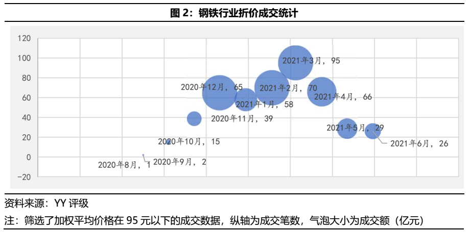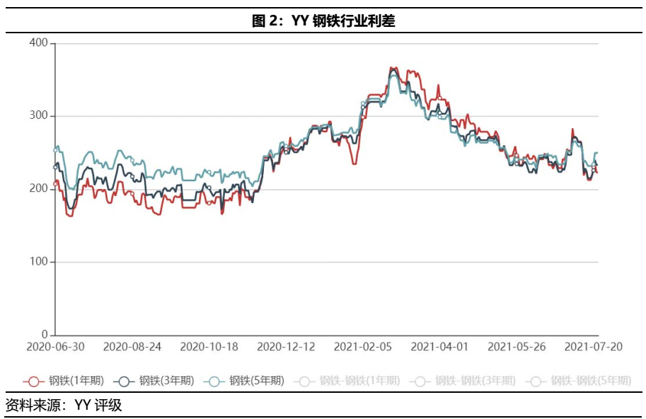 受永煤時間擾動,上半年鋼鐵行業(yè)利差曾一度走闊,折價成交頻現(xiàn)。而現(xiàn)在市場情緒逐漸恢復,在成本上漲、基建退溫與產(chǎn)能高位的基本面下,伴隨著寶武馬不停蹄的整合趨勢,鋼鐵行業(yè)應該怎么看?鋼鐵債的投資機會又在哪里?永煤翅膀煽動,對鋼鐵行業(yè)的利差和異常成交都產(chǎn)生了較大影響,但目前情緒逐漸修復,利差有一定回落、異常成交明顯減少。鋼鐵行業(yè)的利差自2020年11月以來一路走高,直到2021年2月末才逐漸緩和,截至2021年6月末,鋼鐵行業(yè)利差保持在240BP左右的水平。從行業(yè)折價統(tǒng)計成交來看,永煤事件后鋼鐵行業(yè)的異常成交顯著增加,但從2021年4月開始,異常量逐漸減少,市場情緒逐漸緩和。今年上半年,國內(nèi)市場鋼材價格整體在高位區(qū)間震蕩,尤其是5月鋼材價格上演“過山車”行情,截至5月中旬全國鋼材市場八大品種的噸鋼均價突破了6600元。而政策面,從中央到地方各層級主管部門紛紛采取各種措施,抑制鋼材價格快速上漲。根據(jù)公開資料和新聞,近期安徽、甘肅、江蘇、山東等多省加快部署下半年粗鋼限產(chǎn)減產(chǎn)工作,產(chǎn)鋼大省相繼制定壓減下半年粗鋼產(chǎn)量方案,目前部分鋼廠已收到任務指標,未來有望進一步細化限產(chǎn)、減產(chǎn)政策。市場仍有一定減產(chǎn)預期,預計短期鋼價仍有一定支撐。2021年上半年,寶武集團又加快了整合的步伐,2月并入云南的昆鋼控股,5月傳出接管包鋼集團下屬個別子公司的消息(尚未得到官方證實),7月對山鋼集團的整合又提上日程,構造了現(xiàn)在“彎弓射箭”的寶武大格局(彎弓搭箭,是指長江上中下游的馬鋼、武鋼和重鋼為箭,湛江、寶鋼等沿海基地為弓)。回顧寶武一路以來的整合歷程,除了提高鋼鐵行業(yè)集中度的這一主要目標,來勢洶洶下更多的是對市場、區(qū)位的深思熟慮。并入馬鋼,不僅彌補自身原來在華東建材市場的空缺,也和之前的武鋼、重鋼構成長江一線,而昆鋼擁有的西南市場,和擁有近75%山東市場的山鋼,都是其落子的理由。根據(jù)YY評級對鋼鐵行業(yè)主體分類并結合wind,我們統(tǒng)計了2021年上半年鋼鐵行業(yè)的凈融資與存續(xù)債分布情況。2021年上半年鋼鐵行業(yè)新發(fā)債共74只,發(fā)行額共1133.5億元,相比2020年上半年發(fā)行債券數(shù)量124只、發(fā)行總額1792.5億元均有一定下降。從新發(fā)債類型來看,2021年上半年鋼企發(fā)行仍以短期融資券為主,共計發(fā)行968.5億元,規(guī)模占比達85%;其次為中期票據(jù),發(fā)行規(guī)模為82億元,公司債和企業(yè)債發(fā)行較少。從凈融資規(guī)模來看,2021年上半年凈融資-434.85億元,而2020年上半年行業(yè)整體凈融資795.68億元,融資收縮明顯。從發(fā)行票面來看,2021年上半年各券種的發(fā)行票面均值相比去年有一定增加,融資成本提高。截至目前根據(jù)YY評級行業(yè)分類,鋼鐵行業(yè)存續(xù)債主體共計40個(已剔除只發(fā)可轉債的主體)。按投資級、投機級區(qū)分,有近57.5%的鋼企仍位于投資級別(產(chǎn)業(yè)YY評級1-5)。按發(fā)債主體資質(zhì)來看,結合 YY評級分布,鋼企主體較多分布在YY評級5、6和7,占比達70%;細分來看,在YY評級5中主要集中在5-,在YY評級7中主要集中在評級7本身。回溯上半年鋼企的外部評級調(diào)整,只有寧夏晟晏(已有債券展期)外部評級遭到了多次評級機構的下調(diào),而YY評級基于基本面分別對包鋼股份、寧夏晟晏進行了評級下調(diào)。 目前鋼鐵行業(yè)存續(xù)債券共計4122.12億元,存量債排名前十的鋼企為首鋼集團、河鋼集團、山鋼集團、寶鋼股份、鞍鋼集團、沙鋼集團、寶武集團、河鋼股份、華菱鋼鐵、包鋼股份,債券余額共計3330.05億元,約占整個行業(yè)存續(xù)債余額80.8%,行業(yè)的債務集中度較為明顯。從前十大鋼企存續(xù)債的行權分布來看,首鋼集團、山鋼集團、寶鋼股份在一年內(nèi)面臨的行權壓力最大,均超過了260億元;其次為河鋼集團,有252億元;整體來看,這些鋼企的債券都集中三年內(nèi)到期。債務周期放大了信用問題,在重資產(chǎn)的鋼鐵行業(yè)來說,降杠桿是一個長期任務。那么從2015年的鋼材價格低谷到現(xiàn)在,有多少企業(yè)的杠桿下降了呢?經(jīng)過計算,保留了存續(xù)債券20億元以上的鋼企,并剔除母子公司中存續(xù)債較少的一家,如山鋼集團和山鋼股份只保留山鋼集團一家,可以發(fā)現(xiàn):只有少數(shù)鋼企的有息債務是逐年下降的,如華菱集團、太鋼集團、新興鑄管等,大部分鋼企的有息債務一直在逐步攀升,如山鋼集團、柳鋼集團、河鋼集團等。行業(yè)中大多數(shù)主體在景氣度上行的時候,沒有主動壓減債務,那在景氣度走弱的時候,企業(yè)面對的壓力會更大。03 2021上半年基本面復盤