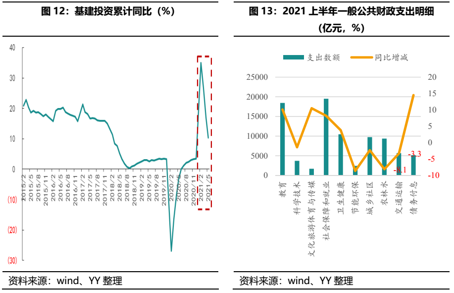 需求來看,鋼鐵的下游需求主要集中在基礎設施建設、房地產(chǎn)開發(fā)、汽車、家電制造、機械制造等。其中建筑用鋼占到總需求的60%,主要包括地產(chǎn)、基建、廠房和公用設施;工業(yè)用鋼占到30%,主要包括機械制造、能源以及造船業(yè);消費用鋼占總需求約10%,其中包括汽車制造、家電等其他。基建方面,進入2021年以后基建投資累計同比增速明顯放緩,另外從資金來源的角度,基建投資也在退溫。首先與基建相關的專項債資金占比下降,2021年上半年新增專項債10144億元,完成全年的28%,從新增專項債具體投向的絕對數(shù)來看,投向交通運輸和市政建設的金額分別為2722.8億元和4349.7億元,去年同期為6808億元、8785億元;相對數(shù)來看,2021年上半年投向交通運輸+市政工程+生態(tài)環(huán)保+能源基礎設施的基建相關地方債占比為53.4%,去年同期為64.7%。另外,一般公共財政支出對于基建的支持力度也在趨緩,就2021年上半年財政收支情況來看,與基建相關的城鄉(xiāng)社區(qū)、農(nóng)林水事務、交通運輸、節(jié)能環(huán)保支出同比下降2.3%、8.1%、3.3%、8.6%,顯示財政支出對于基建的支撐力度不足。地產(chǎn)方面,房地產(chǎn)的大環(huán)境依舊處在房住不炒、嚴監(jiān)管的政策期,另外在集中供地、三道紅線、限購、限貸等多重政策的影響下,預計不會存在上沖的進一步動力,地產(chǎn)用鋼保持溫和。制造業(yè)用鋼來看,2021年年初以來,主要工業(yè)品產(chǎn)量累計同比增速逐漸下滑,尤其是汽車、船舶、家電等累計增速轉弱。3.3 供給端——產(chǎn)能維持高位、易上難下