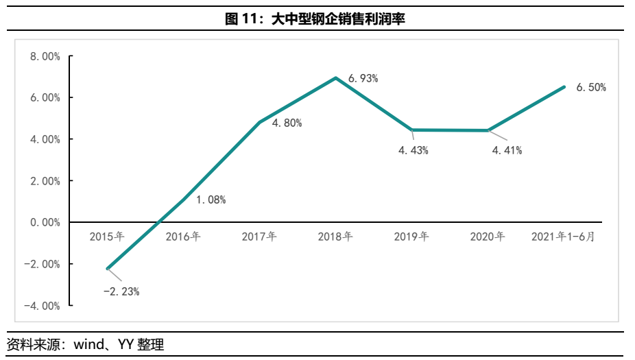 鋼鐵的上游原料成本占到生產(chǎn)成本70%左右,原材料以鐵礦石、焦炭和噴吹煤、廢鋼為主,其中鐵礦石成本又占到原材料成本的一半。而2021年以來鐵礦石價格持續(xù)上漲,受政策監(jiān)管鐵礦石價格5月份有所波動,但仍保持高位,截至2021年6月末,綜合鐵礦石價格指數(shù)為1511.4元/噸。鋼材價格也紛紛漲至高點,五一后熱軋卷板現(xiàn)貨成交價突破6000元/噸,近期有一定回落。高礦價、高鋼價下,鋼廠利潤大幅改善,2021年上半年大中型鋼企銷售利潤率重新回到6.5%的水平。