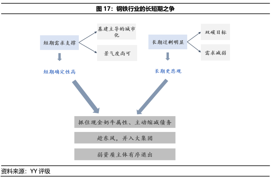 供給端來看,鋼鐵產(chǎn)能具有易上難下的特征。具體數(shù)據(jù)來看,一方面,鋼鐵固定資產(chǎn)投資完成額持續(xù)保持增長,另外由于政策對鋼鐵產(chǎn)能新建的限制,鋼鐵產(chǎn)能擴張主要以技改和產(chǎn)能置換的方式進行,據(jù)不完全統(tǒng)計,在2020-2025年之間仍有近1.5億噸的新增煉鋼產(chǎn)能,預計未來供給端仍有一定抬升。結合上述供需兩端,鋼鐵的上下游多屬于周期性行業(yè),聯(lián)系緊密,投資聯(lián)動性高,因此鋼鐵行業(yè)發(fā)展與經(jīng)濟波動密切相關,具有周期性。這里的周期性,更多的是站在行業(yè)景氣度和盈利的角度,目前我國處于高產(chǎn)量的階段,且下游的需求有一定支撐,因此短期周期性顯著。那長期怎么看?因為鋼鐵的行業(yè)發(fā)展具有共性,美、英、日都經(jīng)歷了高增長、低增長、成熟、衰退和平穩(wěn)期五個階段,從鋼鐵成熟期進入鋼鐵衰退期有10年左右的時間。而我國自改革開放以來鋼鐵產(chǎn)量增速迅猛,直到2013年首次提出壓縮鋼鐵產(chǎn)量,至此我國鋼鐵進入產(chǎn)能過剩階段,隨著基礎設施建設的完備、汽車家電等消費品從首需變?yōu)楦妫司咒撓M量會進入平穩(wěn)階段。再加上對碳排放等環(huán)保要求,鋼鐵等高碳行業(yè)肯定會有一部分被代替。因此長期來看,鋼鐵的本質(zhì)是過剩。因此站在這種長短期博弈的角度來看,鋼企最好的方向有三條,第一,抓住鋼鐵業(yè)務現(xiàn)金奶牛的屬性,收割現(xiàn)金流,在盈利的時候主動降杠桿;第二,趁行業(yè)整合的東風,并入大集團,利用邊際改善自身現(xiàn)狀;第三,經(jīng)濟結構決定經(jīng)濟供給,一些弱資質(zhì)主體在償還完債務后有序退出資本市場。那一家鋼企的資質(zhì)如何?主要在于三個支撐點:首先,產(chǎn)品結構,產(chǎn)品結構的豐富性一定程度上決定了鋼鐵企業(yè)的抗風險能力。高附加值的產(chǎn)品可以為鋼企帶來更高的邊際利潤和銷售溢價;其次,鋼企的區(qū)位腹地支撐,區(qū)位不僅影響其運輸物流成本,也決定了下游需求的剛性;最后,企業(yè)的杠桿與負債,是否在景氣度上行的時候主動壓減債務。基于以上,哪些鋼鐵還有一定挖掘空間呢?經(jīng)濟腹地較好,下游需求有支撐的企業(yè),如山鋼,擁有近75%的山東市場,且靠近日照港,運輸成本優(yōu)勢明顯,再加上寶武整合的后續(xù)推進,可以給企業(yè)帶來融資成本、產(chǎn)品定價等方面的邊際改善;另外如河鋼,雖然之前受永煤、冀中影響,再加上本身人員冗余等短板,估值一路走高。但回顧其真實的資質(zhì),產(chǎn)品豐富且高技術含量的品種鋼比例超過80%,另外背靠京津冀四大港口,運輸條件占優(yōu),再加上華北地區(qū)(特別是雄安地區(qū)的建設)的下游支撐,可適當布局。另外一些經(jīng)營現(xiàn)金流良好,主動降杠桿的鋼企,如華菱集團,也可配置。對于經(jīng)營現(xiàn)金流疲軟,債務短期化明顯、嚴重依賴再融資的中小尾部企業(yè),則需警惕。再結合對于行業(yè)長短期的預期,短期投資鋼鐵債聚焦于:經(jīng)營現(xiàn)金流充沛,真實降債務的主體,或者具備整合能力的大型主體;長期在于:如果不能真實去杠桿,那么債務的高壓可能會帶來行業(yè)壞賬的顯著提升,加劇分化。