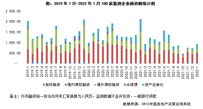 融資總量:2022年1月100家典型房企的融資總量為929.46億元,環(huán)比上升26%,同比下降56%。自2019年以來,每年年初房企融資量都相對較大,均超過2000億元,而本月融資量不足千億元,一方面在當前房企危機仍未全面解除的情況下,金融機構(gòu)當前白名單企業(yè)相對較少,放款較為謹慎;另一方面,部分企業(yè)為緩解年初的償債壓力已提前償還部分債券,同時減少新增融資計劃,導致融資量同比下滑較大。從融資結(jié)構(gòu)來看,境內(nèi)債權(quán)融資499.08億元,環(huán)比上升9.8%,同比下降24.6%;境外債權(quán)融資169.66億元,環(huán)比上升10.0%,同比下降80.1%;本月資產(chǎn)證券化有所回升,融資223.01億元,環(huán)比上升97.9%,同比下降63.0%。